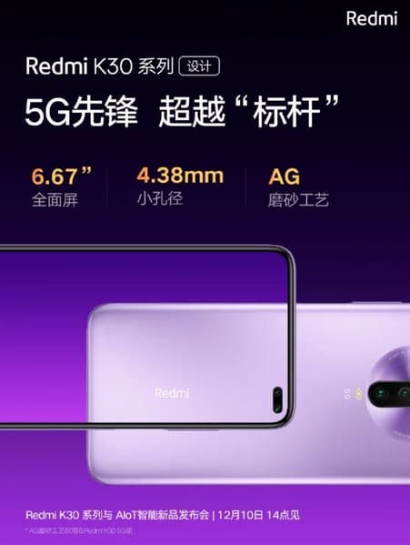 Также тизер говорит о том, что Redmi K30 получил очень компактную сдвоенную врезанную камеру размером 4,38 мм – это так называемая «врезанная камера 2.0». А еще в этой модели используется защитное стекло AG frosted glass – оно прикрывает тыльную панель. Аналогичное стекло применяется, к примеру, в OnePlus 7T.