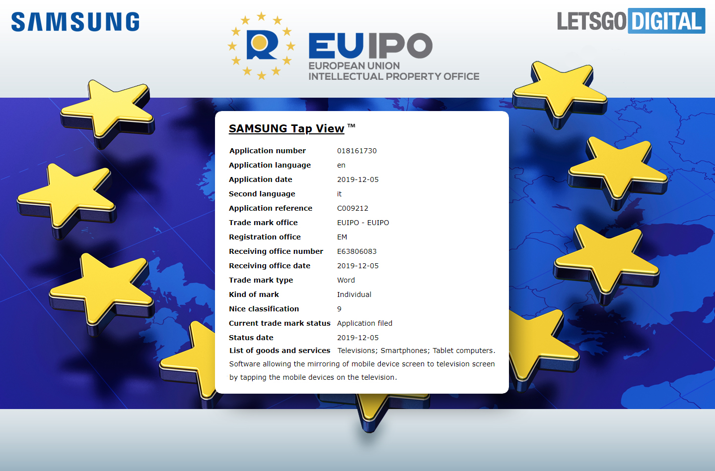 Samsung Electronics зарегистрировала новую торговую марку Samsung Tap View в Бюро интеллектуальной собственности Европейского союза.