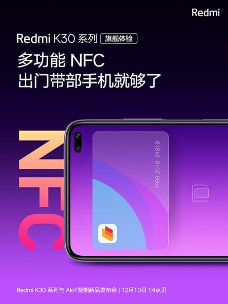Первый постер официально подтверждает, что Redmi K30 получит очень важный модуль, без которого сегодня не обходится ни один флагманский смартфон. Речь идет о модуле NFC, который необходим в частности для работы системы бесконтактных платежей. Да, сегодня NFC можно встретить даже в недорогих моделях, но еще в прошлом году довольно известная компания Meizu умудрилась «забыть» поставить модуль во флагманскую линейку Meizu 16, что, по мнению многих, и не позволило ей обрести заслуженную популярность.