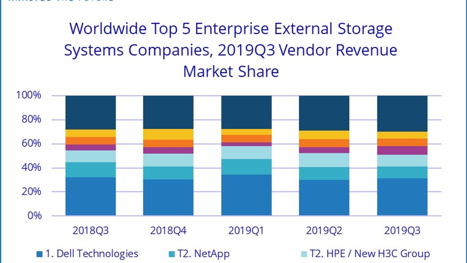 Лидером рынка является компания Dell. Ее доля за год немного уменьшилась — с 32,1% до 31,5%. Доля компании NetApp за год уменьшилась куда заметнее — с 12,4% до 9,9%. В результате эта компания делит второе место с компанией HPE/New H3C Group, доля которой за год уменьшилась с 10,2% до 9,6% (аналитики IDC помещают компании на одну ступеньку рейтинга, если разница в их долях не превышает 1 процентный пункт). Далее следует компания Huawei, которая смогла за год увеличить свою долю с 4,8% до 7,0%. Ее соседями по рейтингу выступают Hitachi (6,2%) и IBM (6,0%). Все остальные производители суммарно обеспечивают 29,9% поставок.