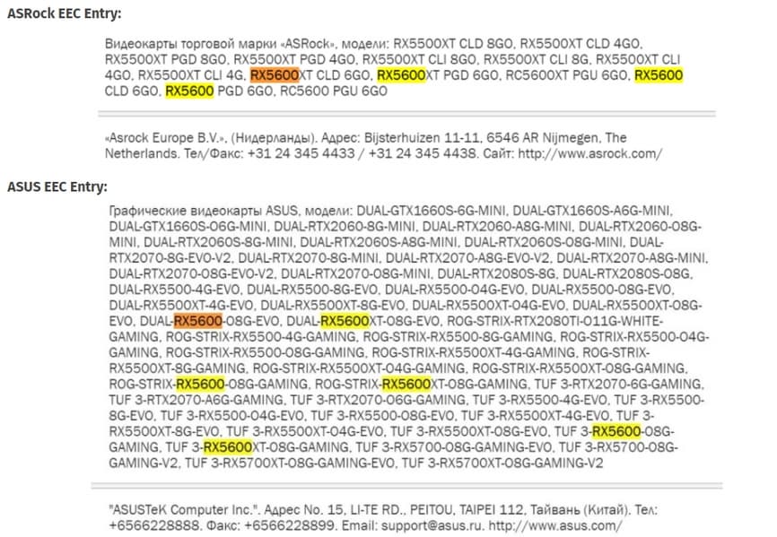В базе EEC засветились видеокарты Radeon RX 5600 и RX 5600 XT производства Asus и ASRock. Первая готовит минимум шесть моделей, вторая — минимум четыре. Параметров мы пока, конечно, не знаем, но есть данные об объёме памяти. Правда, пока с ними не всё ясно. Дело в том, что у моделей ASRock указано 6 ГБ памяти, а у моделей Asus — 8 ГБ. Причём для обеих новых видеокарт.