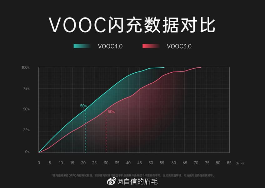 А ещё эта новинка будет поддерживать быструю зарядку VOOC 4.0. Согласно графику, она существенно быстрее, чем VOOC 3.0.