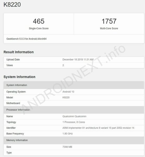 Телефон под кодовым названием K8220 также имеет 8 ГБ оперативной памяти и работает под управлением операционной системы Android 10 из коробки. База данных Geekbench подтверждает, что что устройству удалось набрать 465 баллов в одноядерном тесте и 1757 баллов в многоядерном режиме. Обратите внимание, что эти оценки получены в Geekbench 5.0.3.