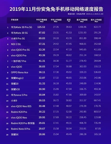 В рейтинге учитываются не только максимальные скорости загрузки и скачивания, но также и средние скорости, и латентность. По совокупности результатов лучшими оказались Huawei Mate 30 5G и Mate 30 Pro 5G, что вполне логично, учитывая, что они оснащены модемами 5G, а сам рейтинг составлялся для Китая, где уже относительно неплохо развиты сети 5G.