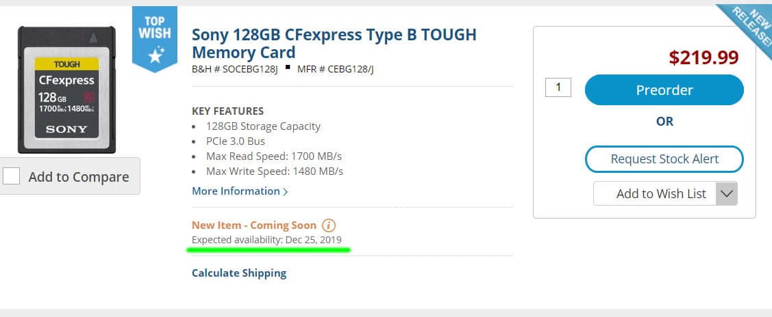 Что касается наличия карт памяти CFexpress в продаже, источник сообщает, что 25 декабря в двух крупных магазинах — Adorama и B&H — начнутся поставки карт памяти Sony CFexpress Type B TOUGH, представленных в феврале. Кстати, пока только они значатся в списке карт CFexpress, поддерживаемых камерами Nikon Z 6 и Z 7.