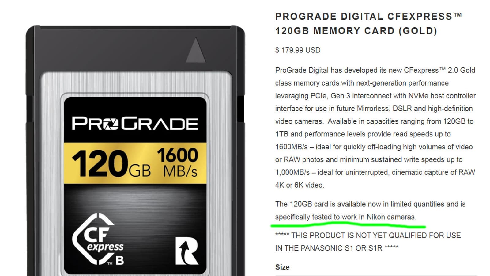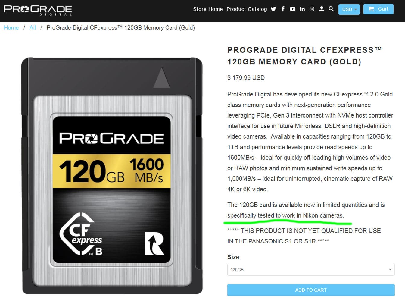 Между тем, другой производитель карт памяти CFexpress — компания ProGrade Digital — тоже проверил на совместимость с камерами Nikon свою продукцию. Судя по тексту на сайте ProGrade Digital, карта объемом 120 ГБ совместима с камерами Nikon.