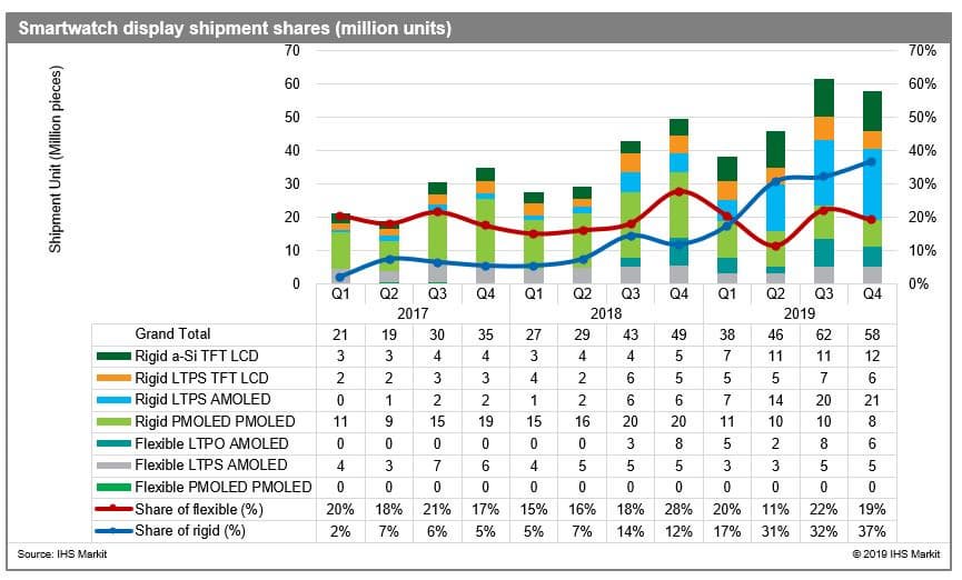 Специалисты IHS Markit проанализировали распределение рынка дисплеев для умных часов между разными технологиями за последние три года и пришли к выводу, что преобладавшие ранее гибкие экраны AMOLED уступили жестким во втором квартале текущего года.