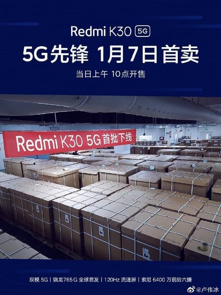 10 декабря компания Redmi представила свой флагманский смартфон Redmi K30, который поддерживает работу в сетях пятого поколения. В середине месяца вышла версия с поддержкой только 4G, а версия с 5G ожидалась в середине января следующего года.
