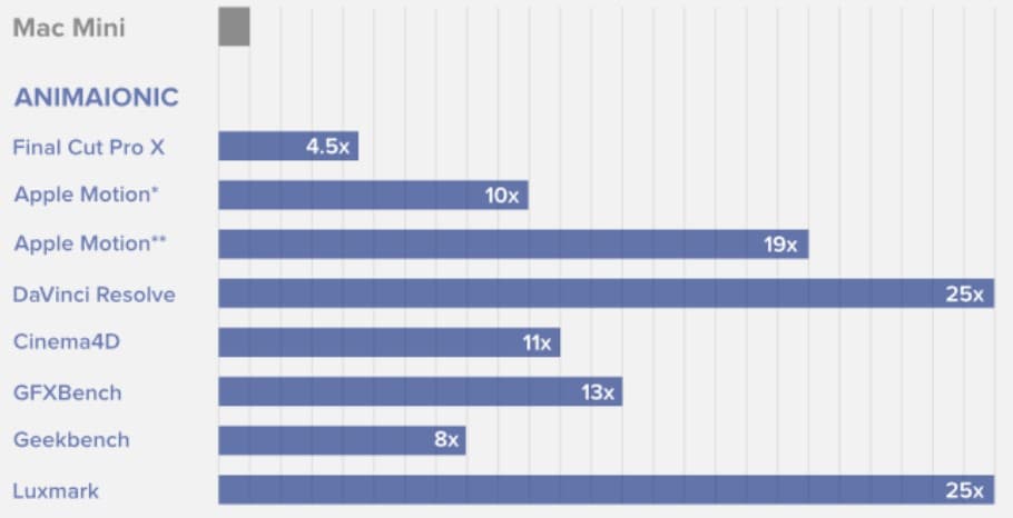 По данным создателей Animaionic, компьютер Mac Mini, установленный в док станцию с парой графических карт AMD Radeon Vega 56, демонстрирует значительно более высокую производительность в ряде популярных тестов и приложений.