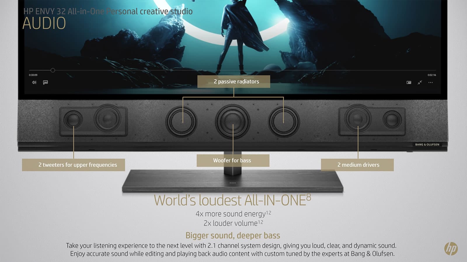 Поддерживается подключение двух внешних мониторов через Thunderbolt 3 или HDMI. Моноблок HP Envy 32 All-in-One является очень громким, производитель даже утверждает, что это самый громкий моноблок на рынке и что вам не понадобятся дополнительные колонки. Динамики и сабвуфер устройства были настроены специалистами Bang & Olufsen. Есть возможность использовать устройство в качестве аудиосистемы для смартфона, даже когда экран отключен. В подставку встроена беспроводная зарядная станция для смартфона.