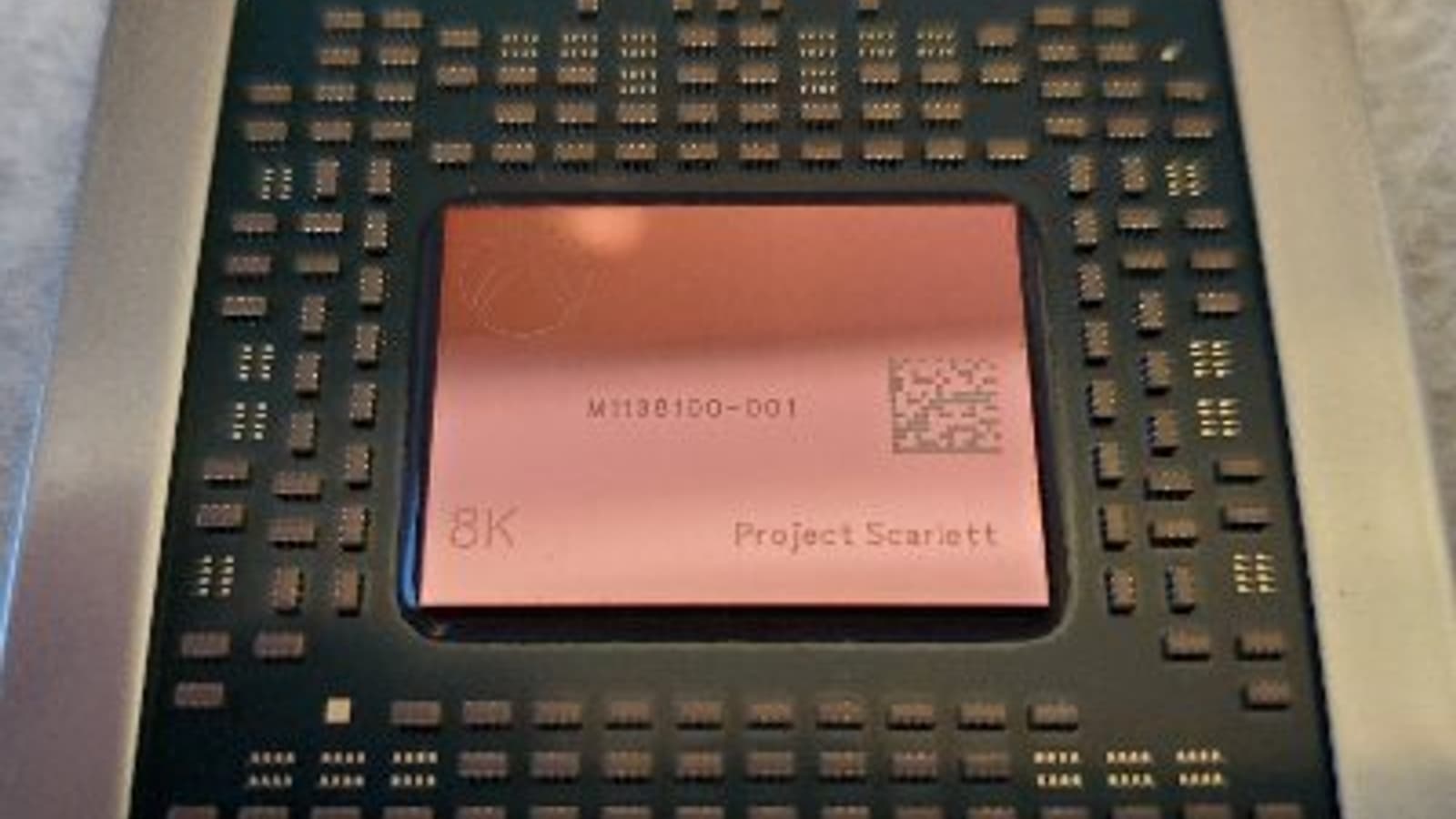 Внешне новая микросхема похожа на ту, что использовалась в Xbox One X (Project Scorpio). На снимке хорошо видео розоватый оттенок, характерный для 7-нанометровых кристаллов AMD, изготовленных на мощностях TSMC. Так же выглядят кристаллы Navi 10, если посмотреть под нужным углом. На кристалле видны надписи 8K и Project Scarlett.