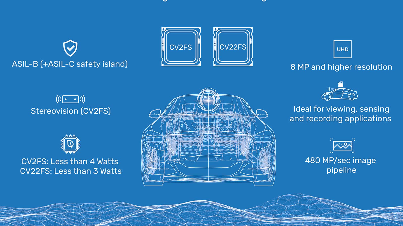 Архитектура CVflow обеспечивает обработку данных, поступающих от камер разрешением 8 мегапикселей с частотой 30 к/с, с целью распознавания объектов на больших расстояниях и с высокой точностью, в том числе — в сложных условиях освещения. Обе SoC включают ускоритель анализа оптического потока. Отличительной чертой CV2FS является поддержка стереоскопических камер.