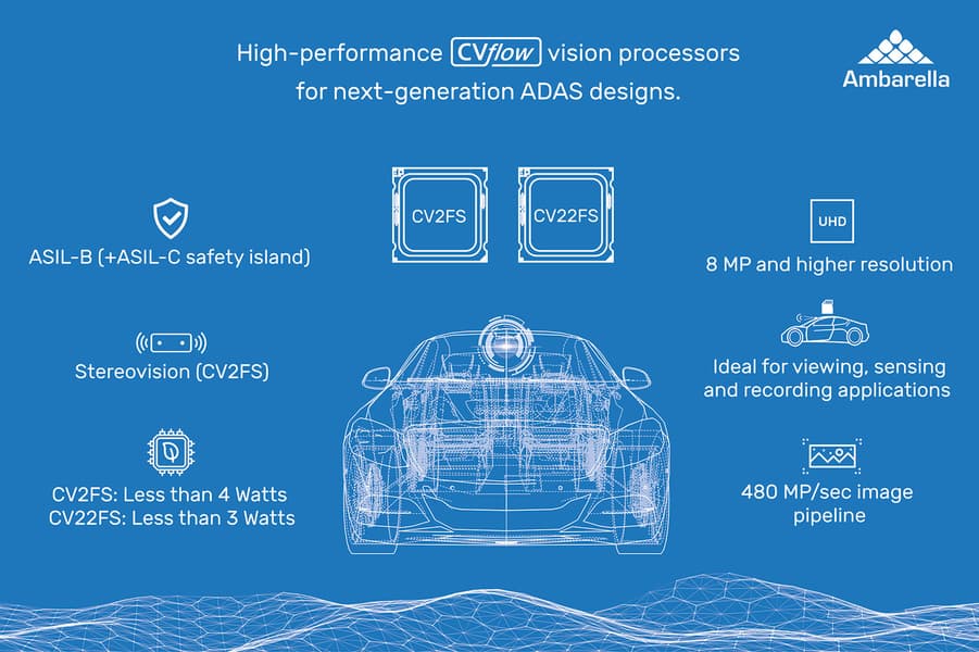 Компания Ambarella приурочила к выставке CES 2020 анонс однокристальных систем CV22FS и CV2FS. Эти SoC на архитектуре CVflow, в которой воплощены алгоритмы искусственного интеллекта, соответствуют требованиям безопасности ASIL B (Automotive Safety Integrity Level). Они предназначены для работы с монокулярными и стереоскопическими камерами систем помощи водителю (ADAS), а также для систем машинного зрения самоуправляемых автомобилей Level 2 и выше. Одним из достоинств CV22FS и CV2FS производитель называет чрезвычайно низкий уровень энергопотребления.