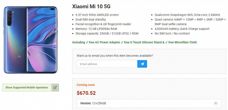 Интересно, что и стоимость Mi 10 5G уже рассекречена: $670 за версию с 256 ГБ флэш-памяти. Это примерно в два раза больше того, что просят за Redmi K30 5G с 8 ГБ ОЗУ и 128 ГБ флэш-памяти.