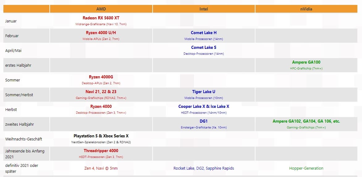 2020 год начался с анонса впечатляющих мобильных процессоров AMD Ryzen 4000 и видеокарты Radeon RX 5600 XT, успех которой пока под вопросом. Специалисты источника решили собрать имеющуюся информацию и слухи в единый график выхода новых продуктов AMD, Intel и Nvidia в этом году.