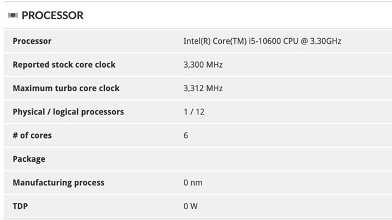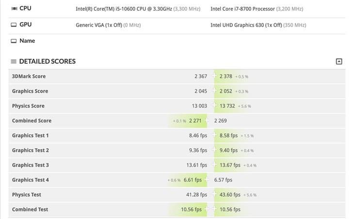 Core i5-10600 засветился в базе 3DMark, благодаря чему, собственно, и удалось сравнить его и Core i7-8700. И тот и другой процессор — шестиядерные и с поддержкой многопоточности. Базовая частота Core i7-8700 — 3,2 ГГц, у Core i5-10600 — 3,3 ГГц. Максимальная частота Core i5-10600 неизвестна, но по логике она должна быть на 100 МГц выше, чем у Core i7-8700. То есть 4,7 ГГц против 4,6 ГГц.