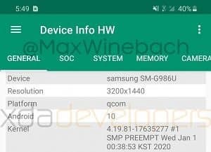 На скриншотах показываются многие характеристики смартфона. В связи с этим можно считать подтверждённым режим экрана с частотой обновления 120 Гц. Кроме того, Galaxy S20+ стал первым флагманом серии Galaxy S без аудиоразъёма 3,5 мм для наушников.