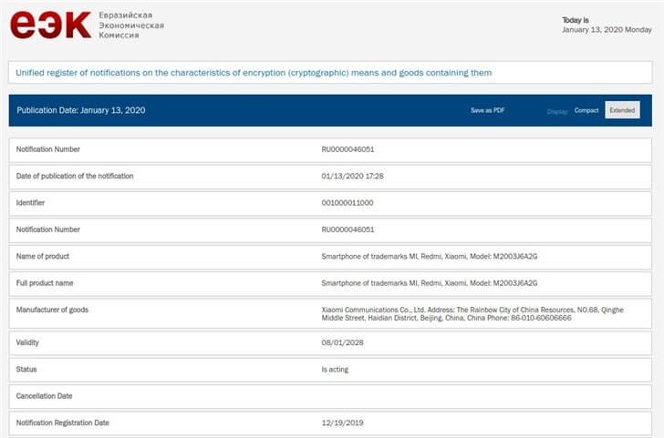 День подробностей о смартфоне Xiaomi Mi 10 продолжается. Сегодня мы уже видели смартфон на рендере (очень похожим на официальный) и на концептуальных живых фото, а сейчас пришла новость сугубо техническая — аппарат сертифицирован в России, Беларуси и Казахстане. На это указывает анализ базы данных ЕЭК.