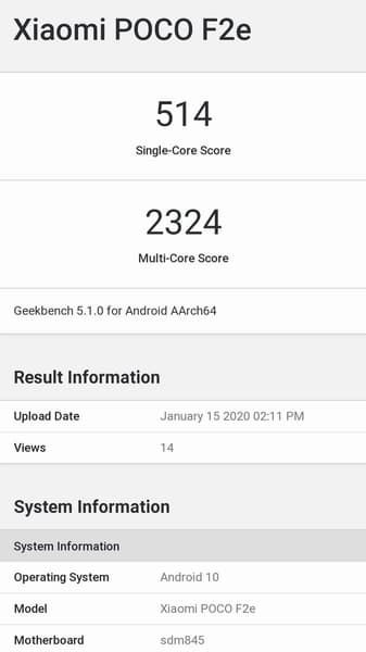 В базе данных популярного бенчмарка Geekbench появились результаты тестирования мобильного устройства, которое получило название Xiaomi Poco F2e.