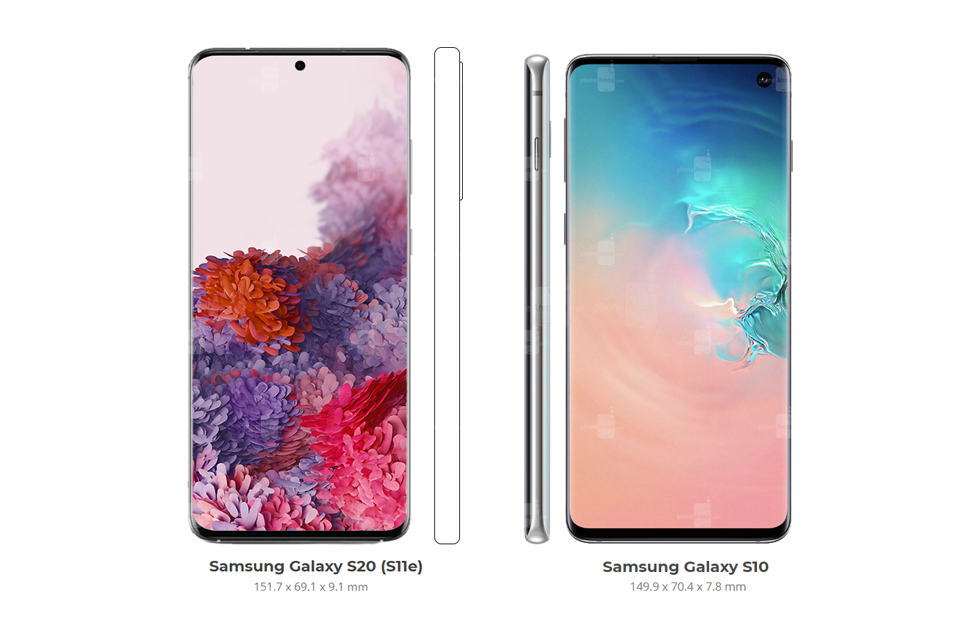 Базовая модель Samsung Galaxy S20 немного длиннее и толще Galaxy S10, но ширина оказалась меньше. Оба смартфона оснащаются 6,2-дюймовым экраном. Размеры составляют 151,7 x 69,1 x 9,1 мм и 149,9 x 70,4 x 7,8 мм. Также смартфон будет легче по сравнению с предшественником весом 157 граммов.