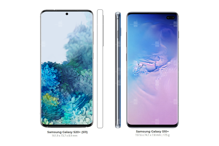 6,7-дюймовый Samsung Galaxy S20+ оказался, закономерно, длиннее и толще 6,4-дюймового Samsung Galaxy S10+. Размеры составляют 161,9 x 73,7 x 8,9 мм против 157,6 x 74,1 x 7,8 мм. Вес ожидается больше, чем 175 граммов у Samsung Galaxy S10+.