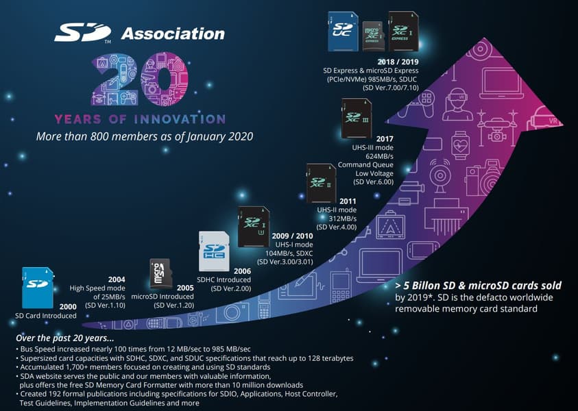 Организация SD Card Association (SDA) празднует 20-летие. Она была создана в январе 2000 года, чтобы разработать и принять стандарт карт памяти Secure Digital (SD), который в последующие годы постоянно развивался. Сейчас карты SD нескольких поколений являются наиболее распространенными сменными носителями на базе флеш-памяти.