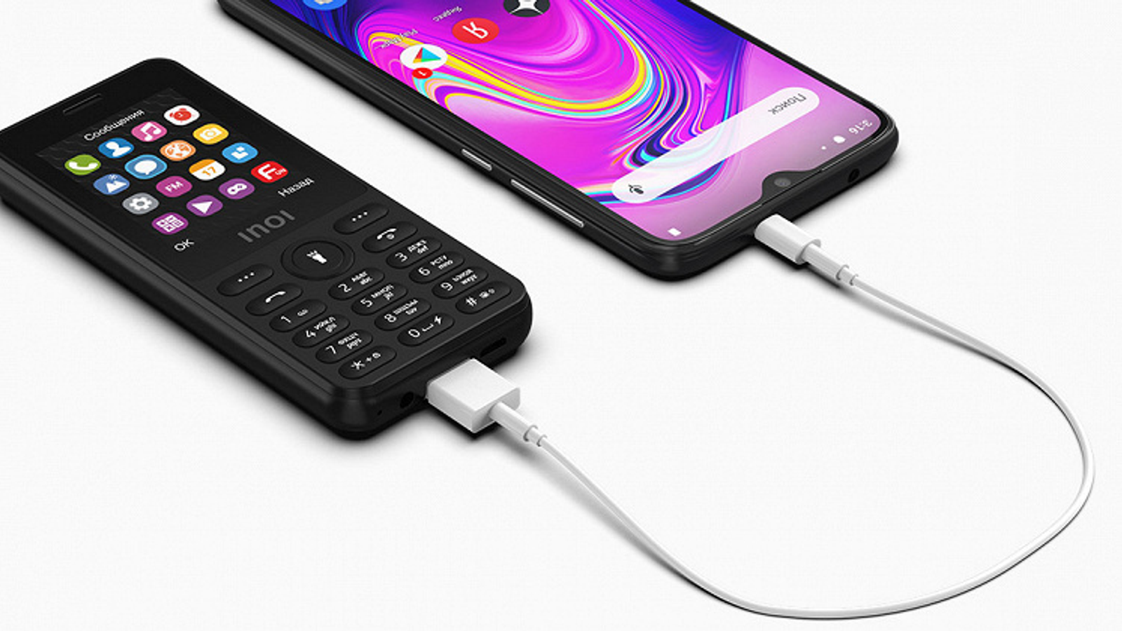 Кнопочные телефоны Inoi 100 и Inoi 101 – базовые модели стоимостью 590 и 690 рублей. Это одни из самых доступных телефонов в России. Также в 2019 году Inoi представил телефон для военных Inoi 244Z, премиальный слайдер Inoi 288, замену DECT — Inoi 104.