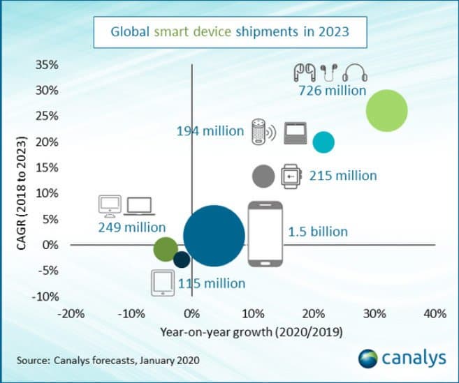 Смартфоны останутся важнейшей категорией, на которую будет приходиться более половины поставок, но рост поставок в этом сегменте будет относительно небольшим. Наибольший рост прогнозируется в сегменте персональных аудиоустройств. Только в этом году наушников и гарнитур будет отгружено 490 млн штук, что на 32,1% превышает показатель прошлого года. Вторая по скорости роста категория — умные колонки. Ожидается, что в этом году поставки умных колонок вырастут на 21,7%, до 150 млн штук.