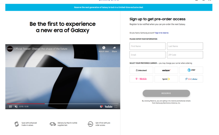 На региональных сайтах Samsung начала появляться возможность зарегистрироваться для доступа к предварительным заказам на Galaxy S20 одним из первых. Зарегистрировавшимся пользователям придёт письмо, по которому можно будет завершить оформление предварительного заказа.