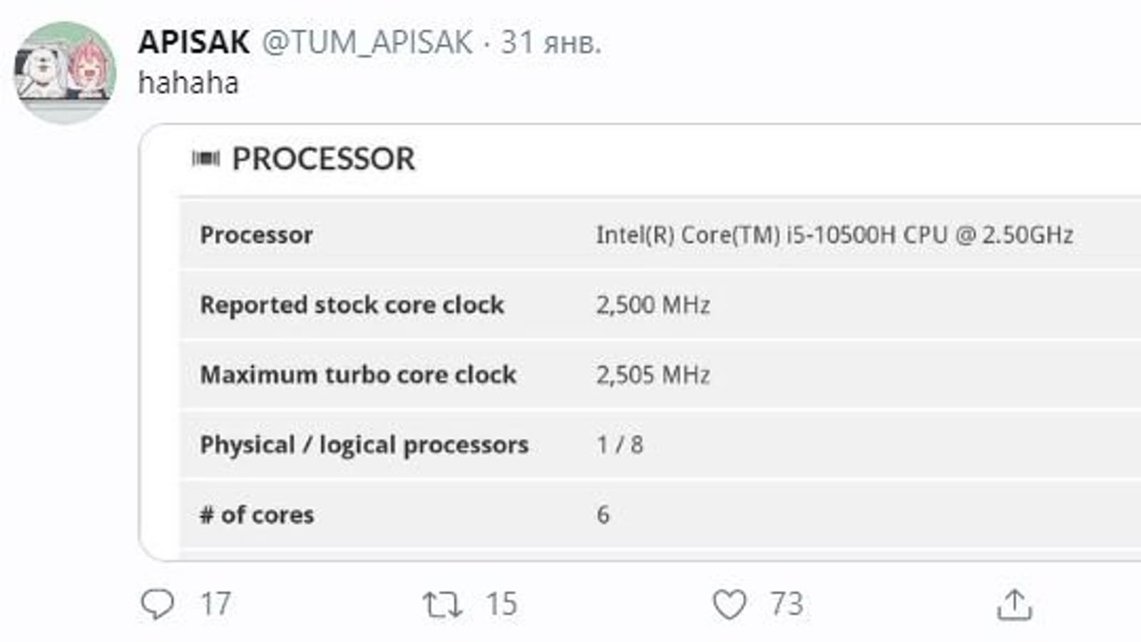 По слухам, Intel собирается вывести на рынок пару высокопроизводительных CPU для мобильных ПК (семейство Comet Lake ) — Core i5-10300H и Core i7-10750H. Но на днях в базе 3DMark засветилась третья модель — Core i5-10500H, и она вряд ли оставит равнодушными как почитателей CPU Intel, так и хейтеров.