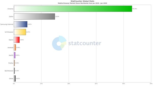 Если говорить о мобильных устройствах, то здесь у Google Chrome 60,26% рынка. Второе место занимает Safari с рыночной долей 20,9%, а на третьем оказался фирменный браузер Samsung, который смог занять 6,83% рынка.
