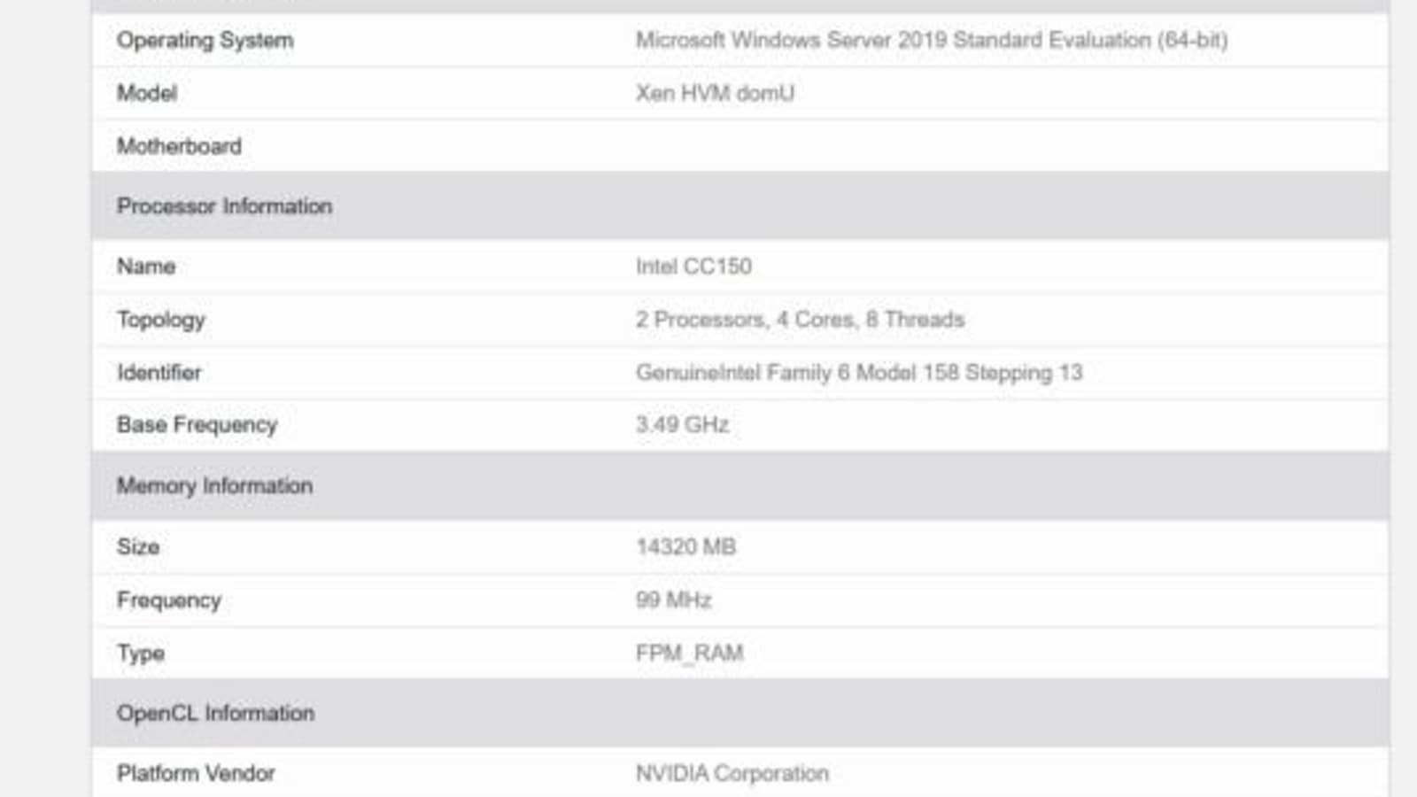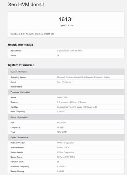 База бенчмарка Geekbench стала источником новых подробностей сразу о двух новинках: процессоре Intel CC150 и видеокарте Nvidia RTX T10-8. Эти устройства, как пишет источник, входят в состав сервера под названием Xen HVM domU – он будет использоваться в сервисе Nvidia GeForce Now. Фактически, именно такие мощности будут предоставлены подписчикам сервиса, но не в полном объеме.