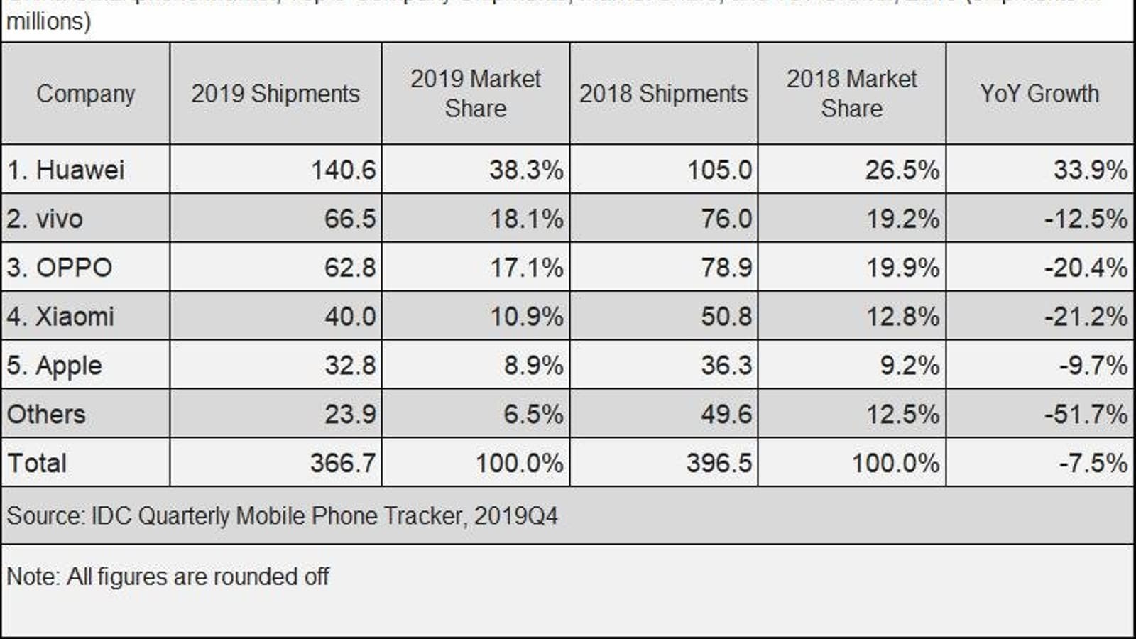 Специалисты аналитической компании IDC подсчитали, что в 2019 года в Китае было продано 366,7 млн смартфонов. Это на 7,5% меньше, чем в 2018 году, что является следствием насыщения рынка и сложной экономической ситуации. В четвертом квартале было отгружено 86,2 млн устройств, что на 15,6% меньше в годовом выражении. Аналитики отмечают, что это был одиннадцатый подряд квартал сокращения рынка.