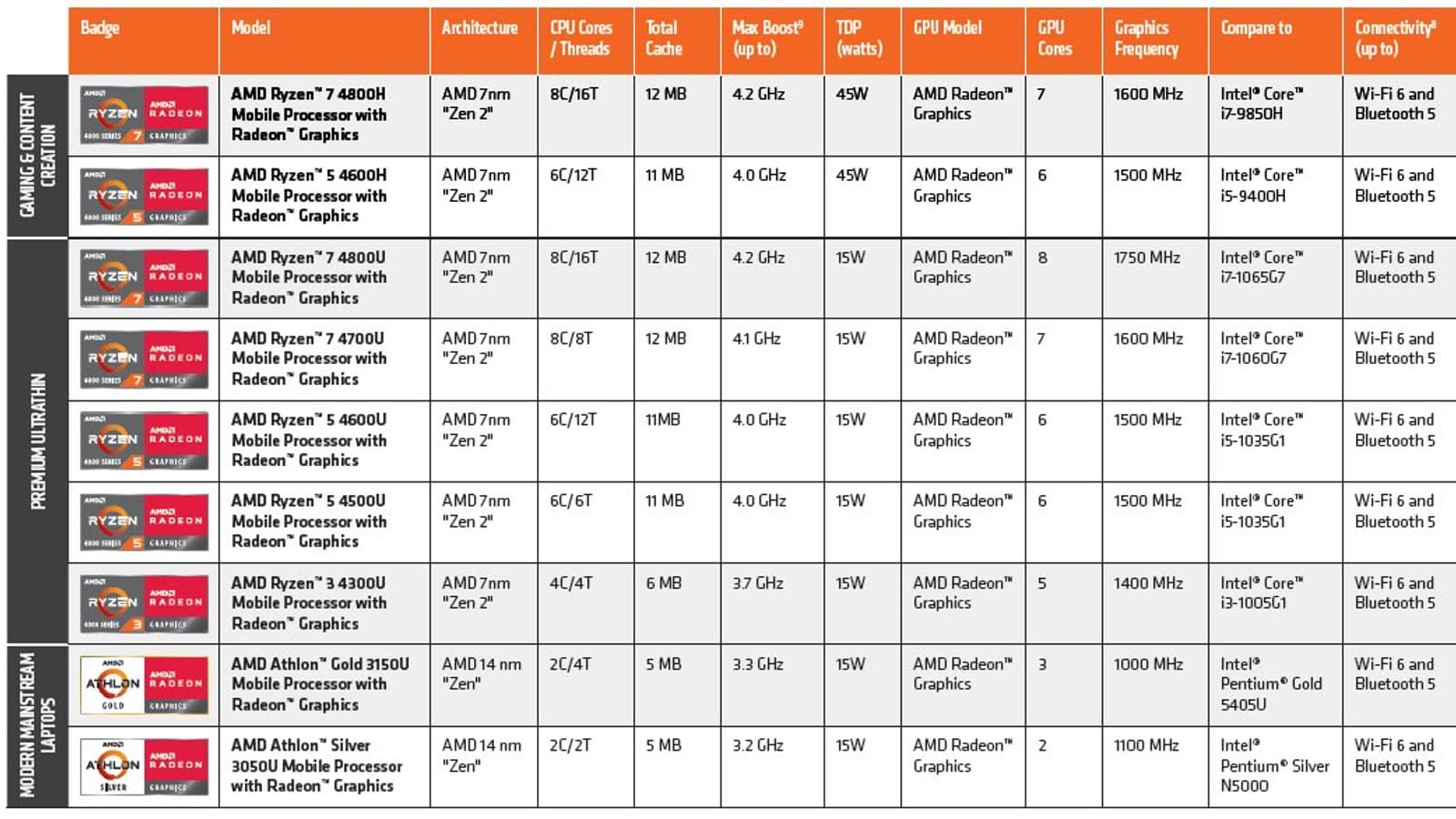 Можно видеть, какие именно CPU Intel противопоставляются каждому из новых APU AMD, включая модели Athlon 3000. При этом сравнение явно составлено не на основе производительности, так как восьмиядерный Ryzen 7 4800U явно не оставит никаких шансов четырёхъядерному Core i7-1065G7. Скорее всего, конкуренты выбраны на основе цен, хотя сами цены на мобильные процессоры AMD зачастую не раскрывает.