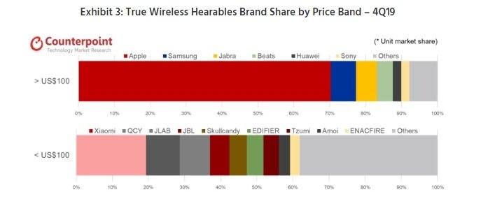 Аналитики также поделились статистикой по итогам прошлого квартала, разделив все наушники на две категории: до 100 долларов и более 100 долларов. В первом случае лидером является Xiaomi, удерживающая почти 20% рынка. Во втором 70% забрала Apple.