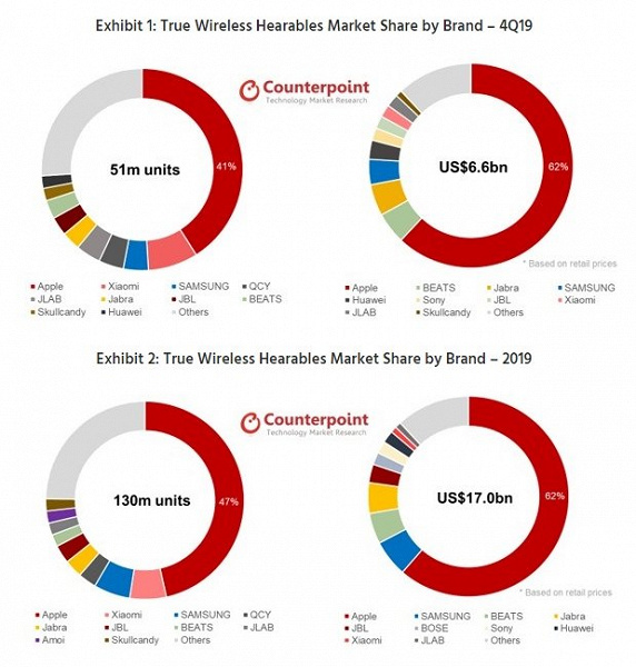 Аналитики Counterpoint в очередной раз это подтверждают в своём свежем отчёте. По итогам прошлого года Apple без учёта принадлежащего ей бренда Beats заняла 47% рынка полностью беспроводных наушников в количественном выражении и 62% — в денежном. В первом случае рынок оценивается в 130 млн единиц, из которых на долю Apple пришлось более 60 млн, во втором речь о 17 млрд долларов, из которых Apple забрала более 10,5 млрд.