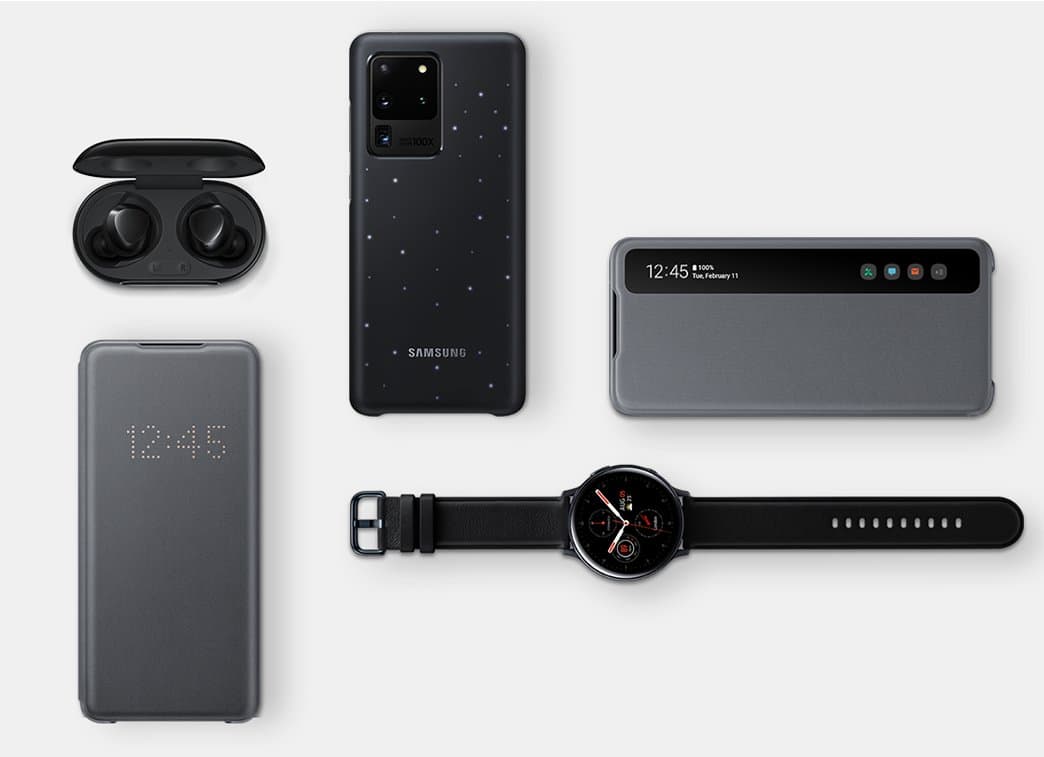 А так выглядит старшая модель Galaxy S20 Ultra в защитном чехле рядом с беспроводными наушниками и умными часами Samsung в черном цвете.