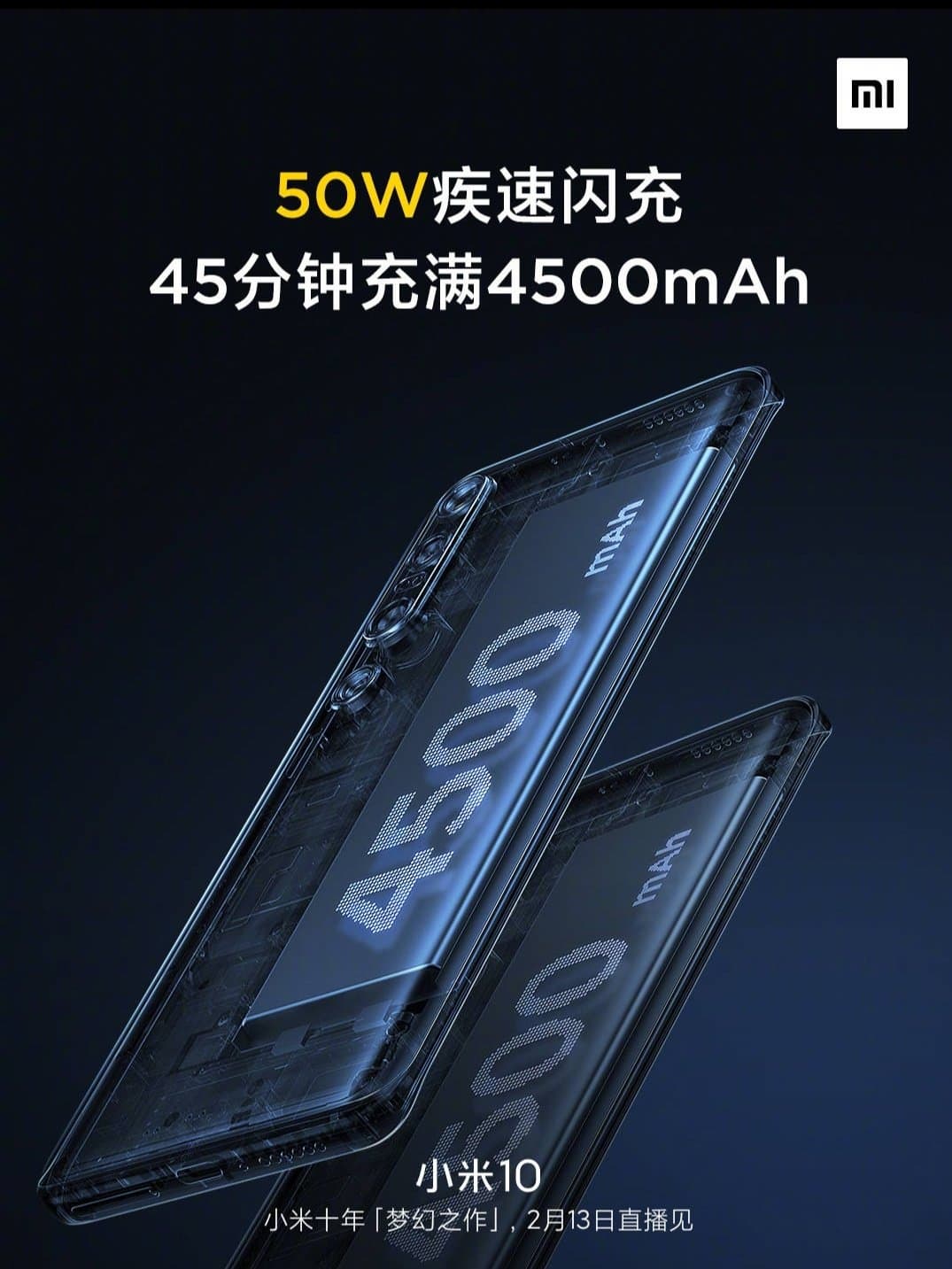 Вчера в социальной сети Weibo директор по новой продукции Xiaomi Ван Тенг Томас (Wang Teng Thomas) официально подтвердил, что емкость аккумулятора Xiaomi Mi 10 составит 4400 мА•ч. Теперь же появился официальный постер, который указывает на то. что емкость аккумулятора равна 4500 мА•ч.