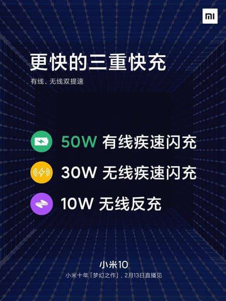 Итак, Xiaomi объявила о том, что флагманский смартфона Xiaomi Mi 10 получил тройную быструю зарядку. Мощность проводной зарядки Xiaomi Mi 10 составляет 50 Вт, она позволяет полностью зарядить смартфон за 45 минут. Беспроводным путем флагман будет заряжаться при максимальной мощности 30 Вт. Кроме того, он может заряжать другие мобильные устройства беспроводным способом при мощности 10 Вт.
