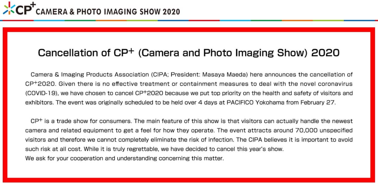 Причиной названа вспышка короновируса (COVID-19, ранее также использовалось обозначение 2019-nCoV), точнее «отсутствие эффективных мер лечения и сдерживания» соответствующего заболевания. Поскольку своим приоритетом организация Camera & Imaging Products Association (CIPA), проводящая выставку, считает здоровье и безопасность участников и посетителей выставки, ее решено отменить.