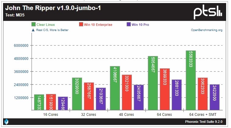 Ресурс Phoronix предлагает и вовсе отказаться от Windows в пользу Linux. Наши коллеги провели тестирование 64-ядерного монстра AMD, используя систему Clear Linux 32280 с ядром Linux 5.5. Для сравнения были также проведены тесты в Windows 10 Enterprise Build 18363 и Windows 10 Pro Build 18363.