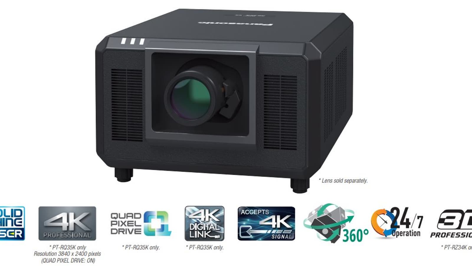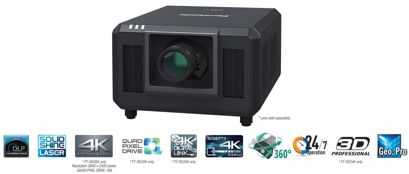 Компания Panasonic представила на мероприятии ISE 2020, которое недавно прошло в Амстердаме, проектор PT-RQ35K. По словам производителя, самый маленький и легкий в мире лазерный проектор 3-DLP со световым потоком 30 000 лм. Его разрешение равно 4К (3480 х 2400 пикселей). В серию также вошла модель PT-RZ34K разрешением WUXGA (1920 х 1200 пикселей).