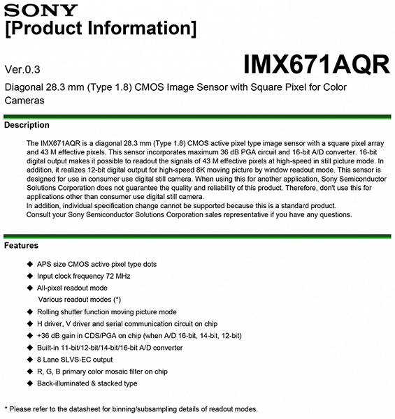 В распоряжении источника оказались спецификации датчика изображения Sony IMX671AQR. Этот датчик формата APS-C с обратной засветкой и объемной компоновкой характеризуется разрешением 43 Мп. Он поддерживает 16-разрядное представление данных при фотосъемке и возможность съемки видео 8K с 12-битным представлением данных.