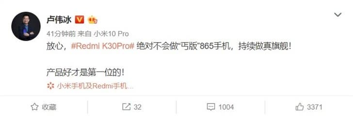 Глава бренда Redmi Лю Вейбинг (Lu Weibing), наказанный вчера за преждевременное раскрытие данных о смартфоне Redmi K30 Pro, сегодня как ни в чем не бывало продолжил высказываться об этой модели. На этот раз «интервенция» ограничилась лишь словами, но зато какими!