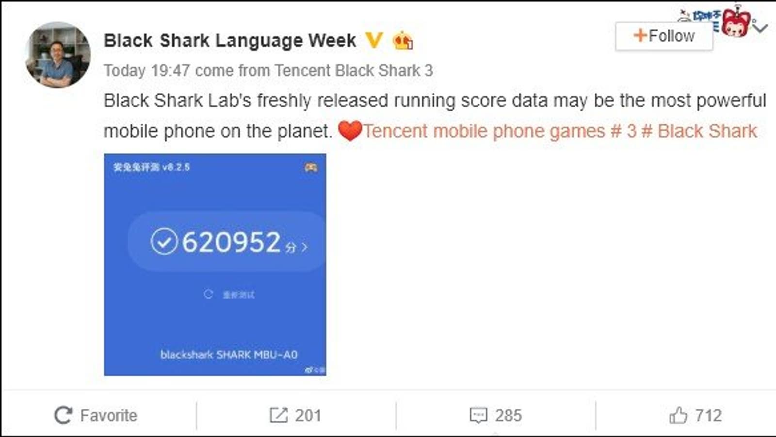Генеральный директор бренда Black Shark продемонстрировал скриншот AnTuTu, где видно, что смартфон набирает 620 952 балла!