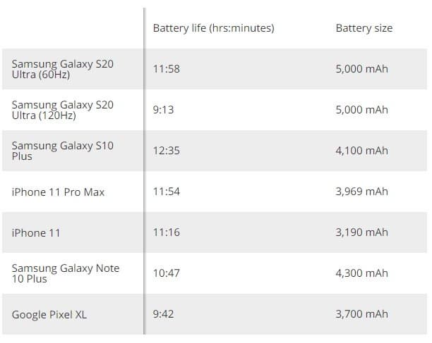 Как можно видеть, результаты Galaxy S20 Ultra (в режиме 60 Гц), Galaxy S10 Plus и iPhone 11 Pro Max очень близки, но победил всё же прошлогодний флагман Samsung. Да, у него менее ёмкий аккумулятор, чем у его преемника, но существенно меньший экран и нет прожорливого модема 5G.