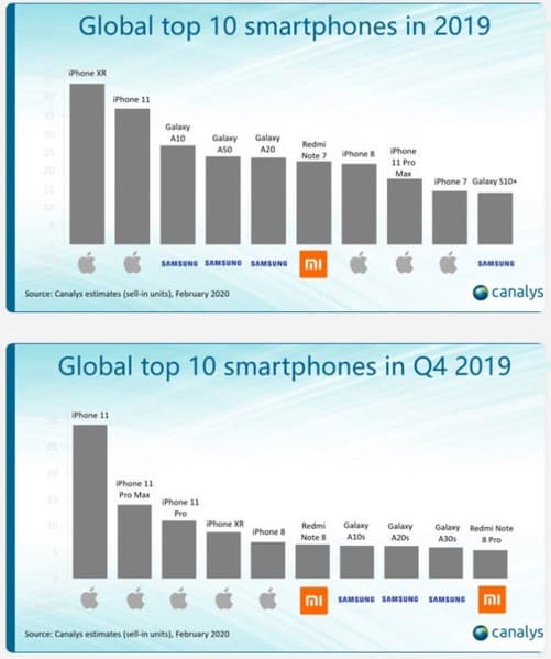 Если брать только четвёртый квартал, а не весь год в целом, то здесь картина несколько иная. В последнем квартале года лидером оказался iPhone 11. При этом лидером среди смартфонов с Android за квартал оказалась вовсе не корейская Samsung, а китайская Xiaomi — Redmi Note 8 стал самым продаваемым в мире смартфоном на базе Android по итогам четвертого квартала прошлого года. Он немного опередил Samsung Galaxy A10s, A20s и A30s. Замыкает десятку Redmi Note 8 Pro.