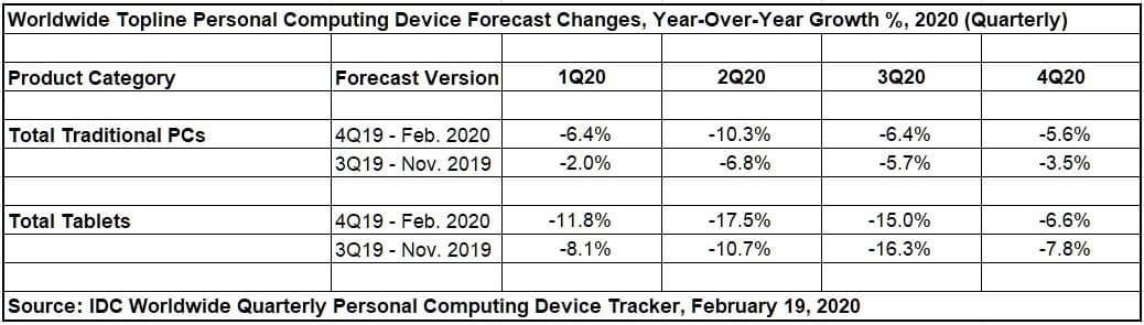 Сокращение в текущем году обусловлено двумя важными факторами: предшествовавшим ростом в связи с переходом от Windows 7 к Windows 10 и вспышкой коронавируса. На первый квартал прогнозируется сокращение в годовом выражении на 8,2%, а на второй — на 12,7%, поскольку скажется исчерпание складских запасов компонентов и готовой продукции. С разбиением по квартам и категориям прогноз приведен в таблице.