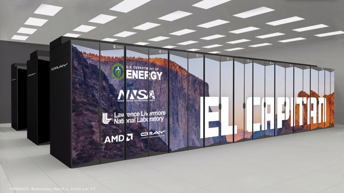 Компания AMD сегодня опубликовала пресс-релиз, в котором рассказала о суперкомпьютере El Capitan и его особенностях. Напомним, это система уровня exascale (1018 операций с плавающей запятой в секунду), которая создаётся по заказу Министерства энергетики США компанией Cray.