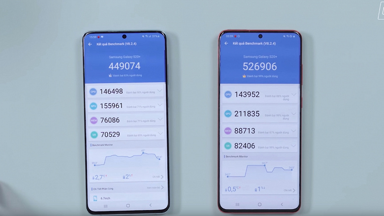 Начнём с внушительной разницы в бенчмарках. В AnTuTu v8 версия с SoC Snapdragon 865 набирает чуть более 526 000 баллов, а версия с Exynos 990 — чуть более 449 000 баллов, то есть первая опережает вторую на 17%. И в основном за счёт разницы в производительности GPU.